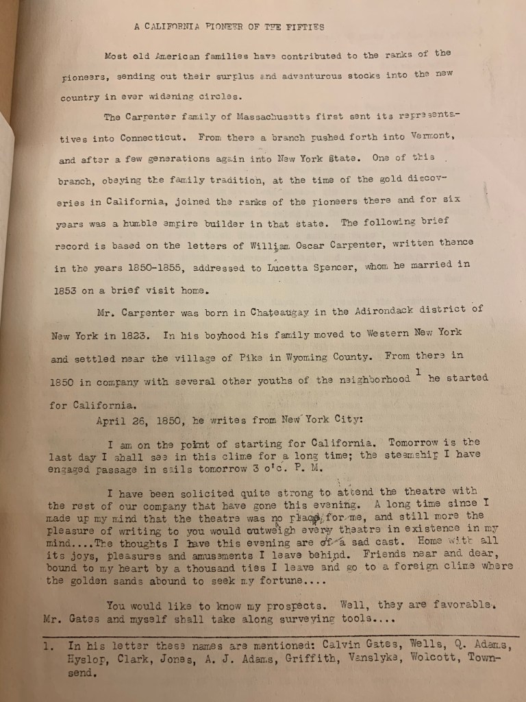 Which brings me to the March, or the Rush, or the seeking of warmth in winter. And which introduced me to William O. Carpenter, a young man who set off from upstate New York to find his fortune in California in 1850. He was not a great historical figure, a John Sutter or a James Marshall, not one of the great gold rush millionaires or early California gold Barrons. When I first found his letters I assumed they would be a quick read, something that might have a few observations on Sacramento that I could use and then move on. I was struck at first that his file was very thin, that his letters had been typed up by someone in the past. I was delighted that they would be a fast and easy read.
