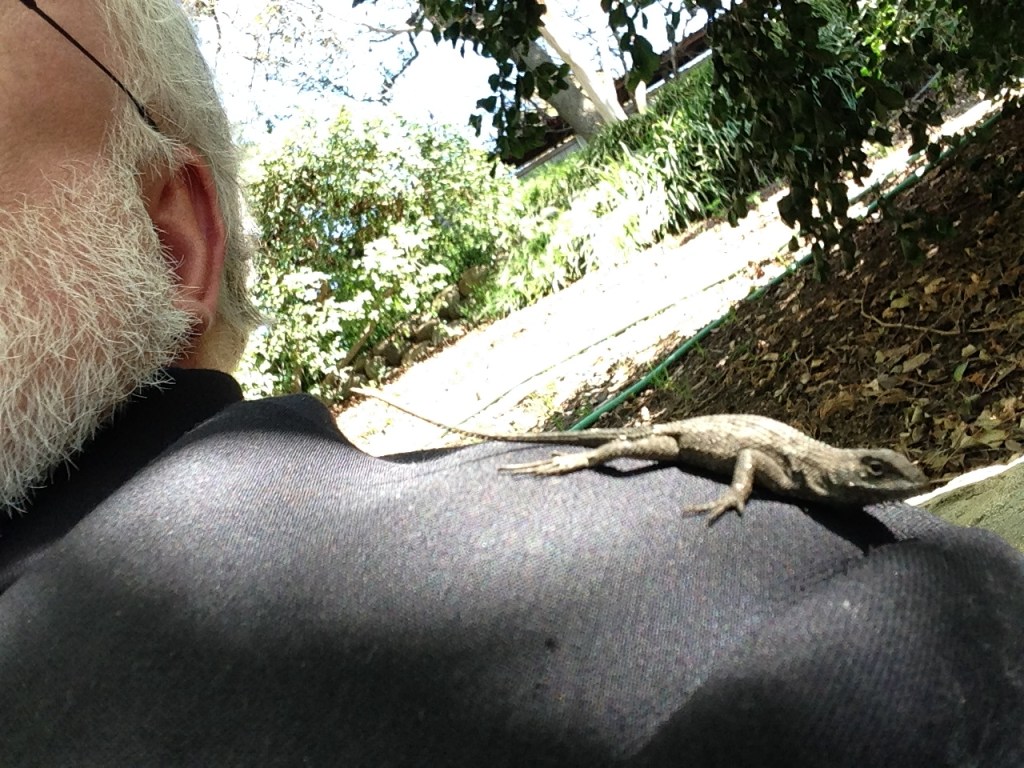 Once, after lunch, I was sitting alone on a bench overlooking the Japanese garden, feeling one with the world. People kept walking by, and some started smiling at me. I thought I must just be a perfect model of happiness and contentment. Then someone said, “I like your friend!” And laughed as she strolled by. What was she talking about? Then I notice a small lizard had crawled up onto my shoulder, and was as happy there in the sunshine as I was on the bench! Instead of being startled, I felt even more at home in this world.